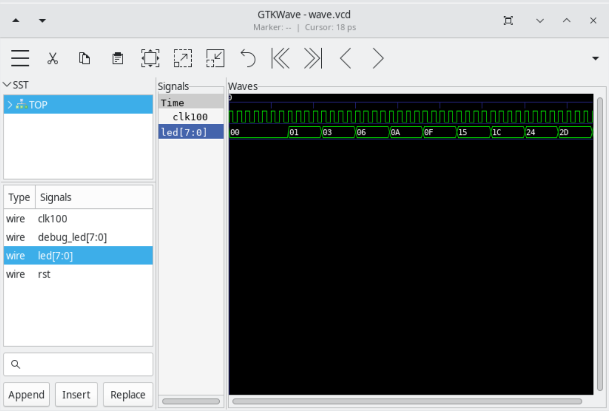 同時也會產生 wave.vcd 這時可以用 gtkwave 看波形