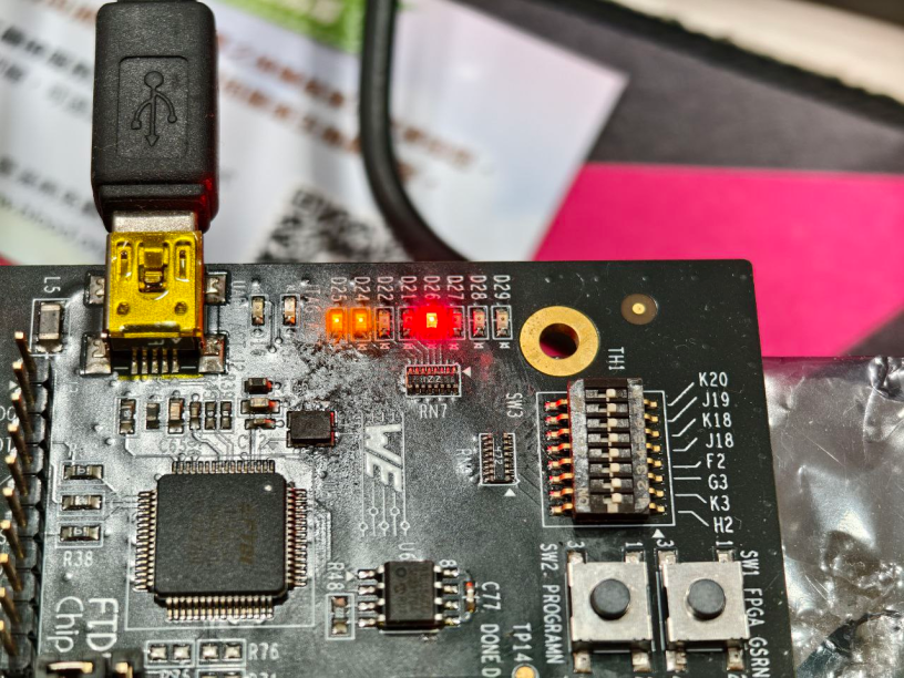 make program 之後就可以燒到 FPGA 板子上啦,輸出的燈號是反向的