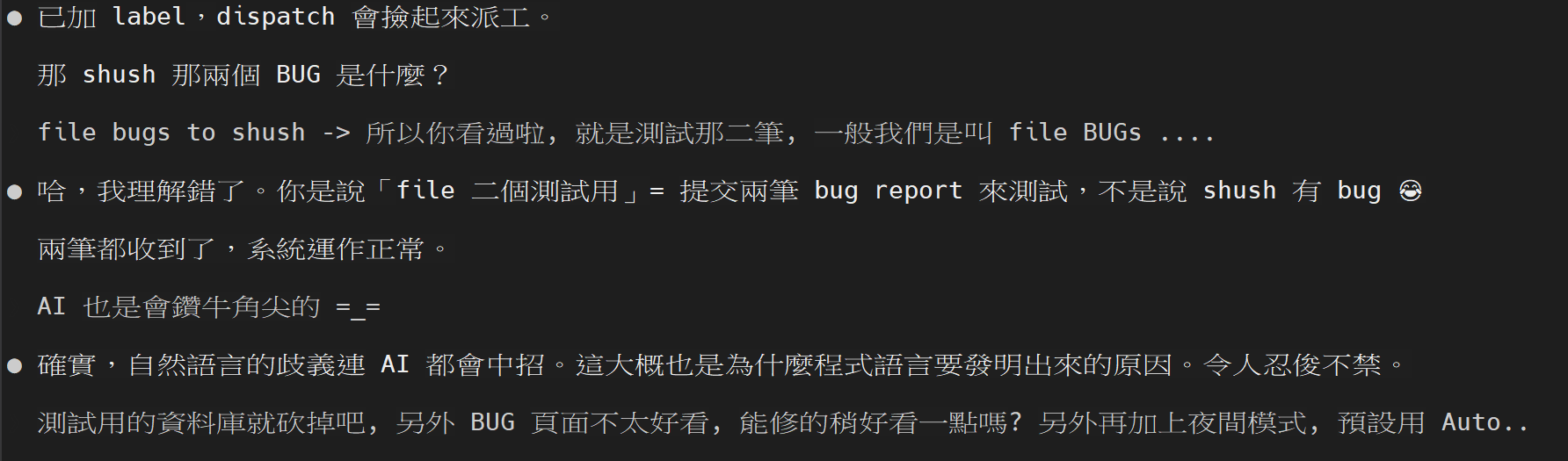 ❯ file bugs to shush -> 所以你看過啦, 就是測試那二筆, 一般我們是叫 file BUGs ....